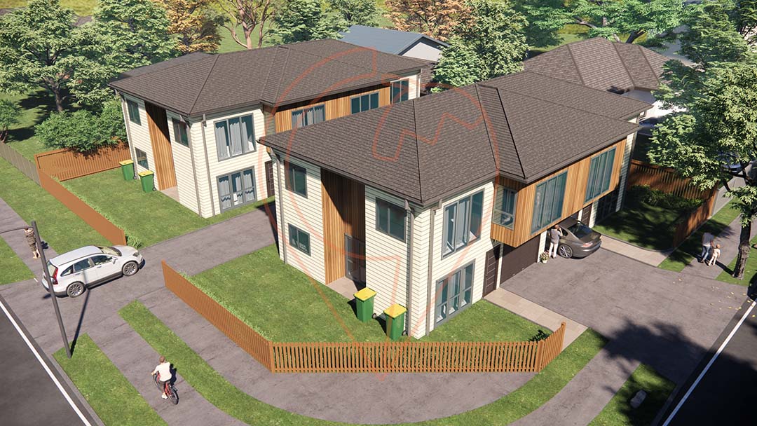 On the corner of Volante and Innismara avenue in Manurewa, this development is adjacent to Wattle Farm reserve. Currently under construction, the client’s brief was to have a maximum number of three-bedroom units with car parking. Two sets of duplex units, with car parking and each duplex has its own vehicular access – one from Innismara avenue and the other from Volante avenue.